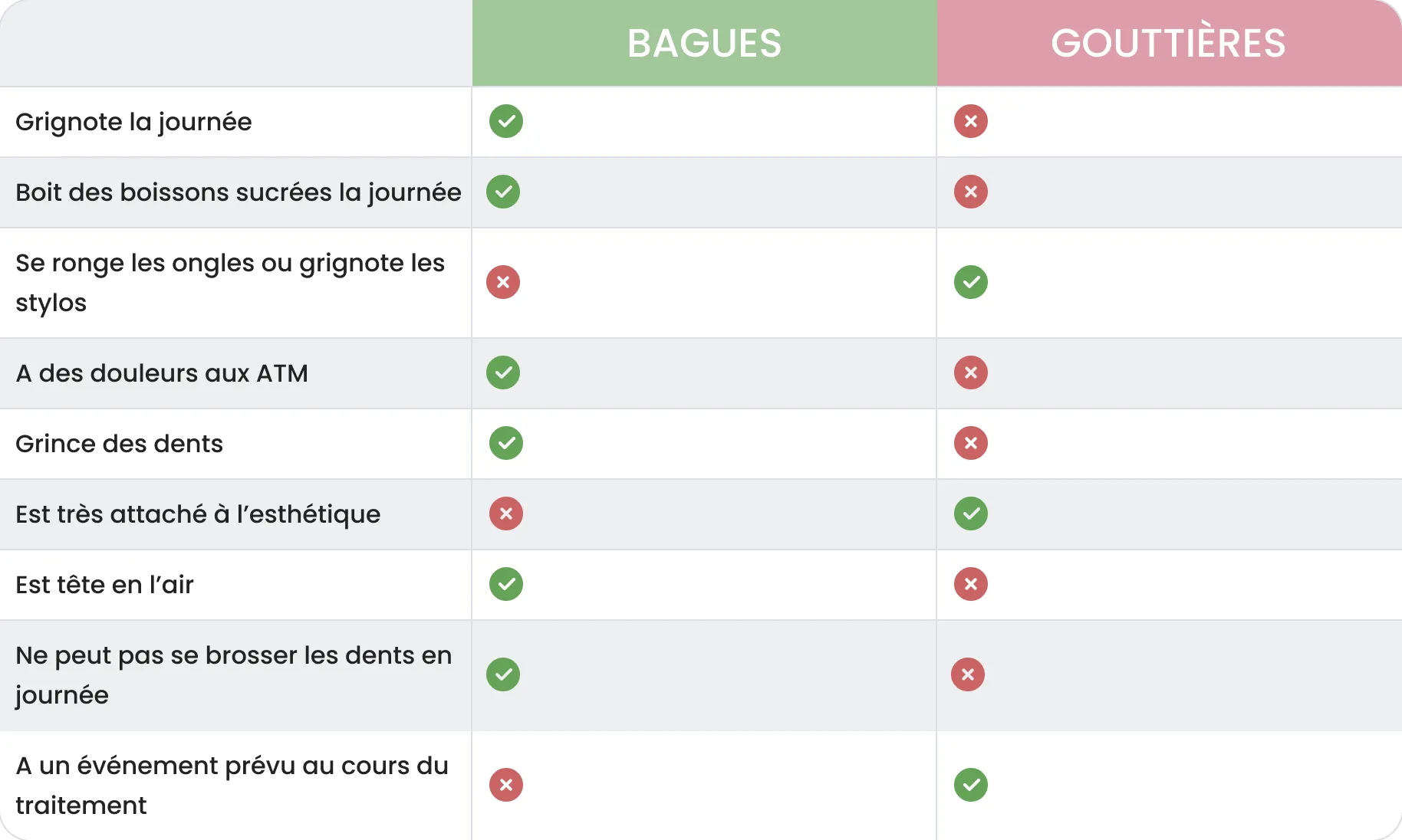 Le choix entre bagues et gouttières ne repose donc pas uniquement sur l’alignement des dents, mais aussi sur le comportement et l’organisation de l’adolescent au quotidien. La grille de questions ci-dessous permet d’ouvrir la discussion et d’orienter la réflexion de manière simple et concrète.
