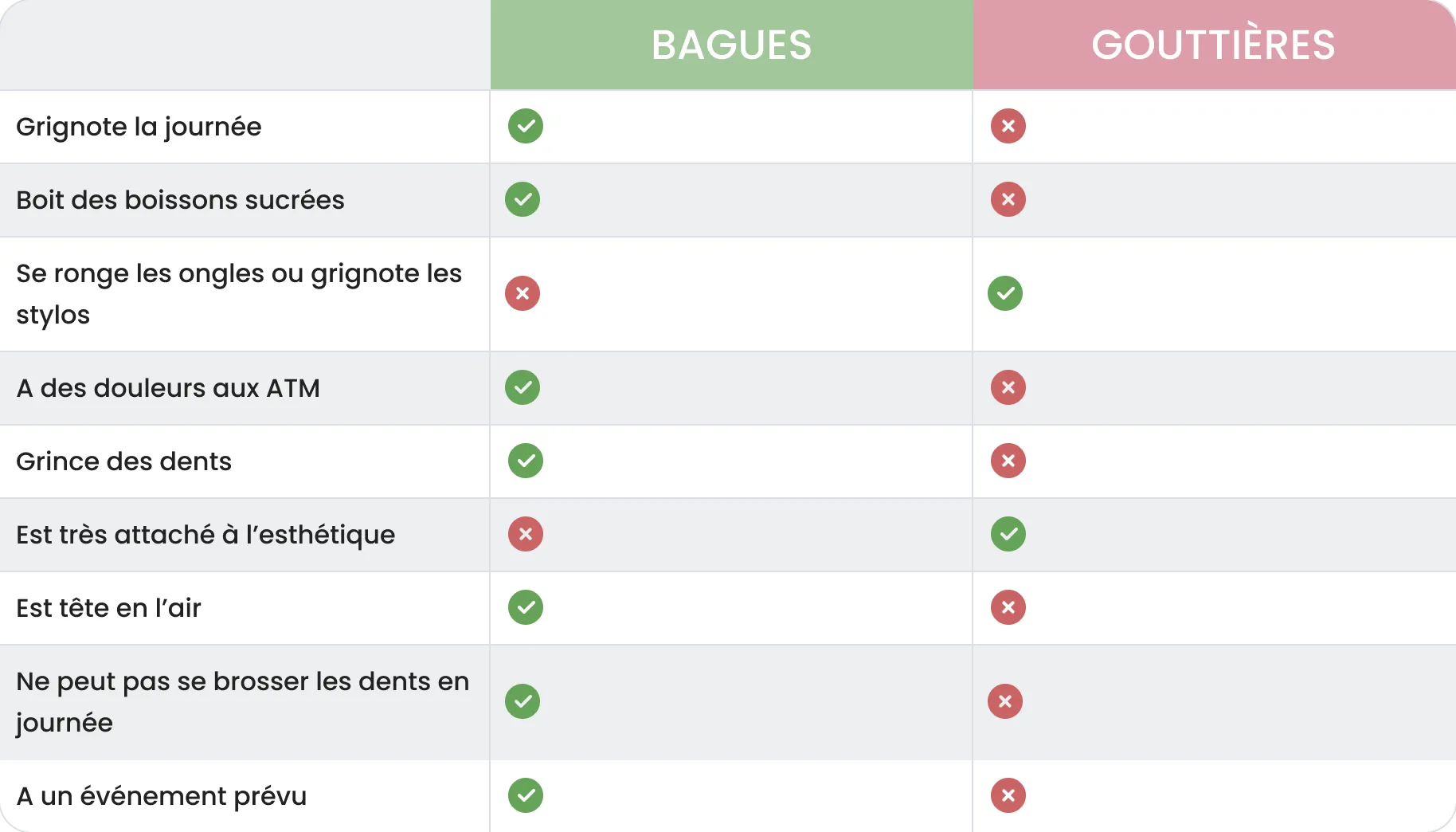 Le choix entre bagues et gouttières ne repose donc pas uniquement sur l’alignement des dents, mais aussi sur le comportement et l’organisation de l’adolescent au quotidien. La grille de questions ci-dessous permet d’ouvrir la discussion et d’orienter la réflexion de manière simple et concrète.